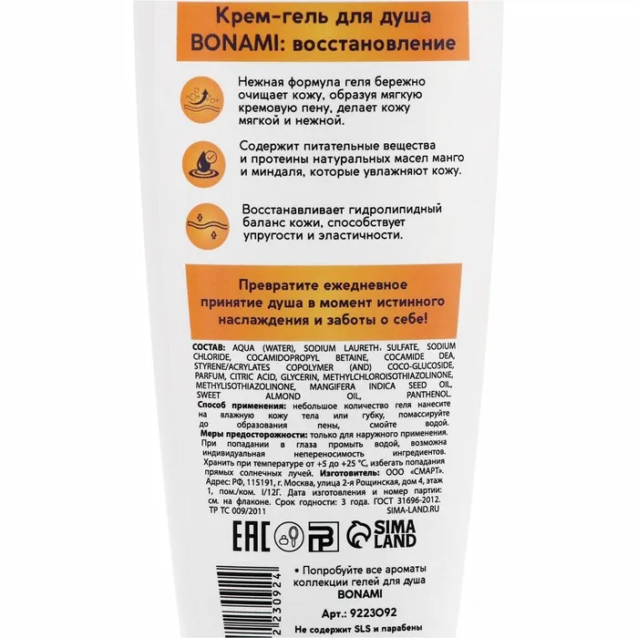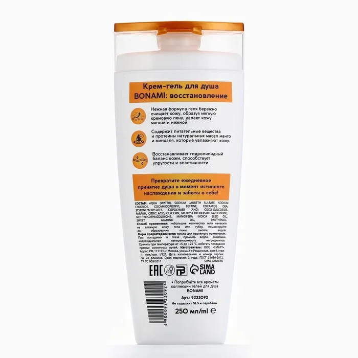 Гель для душа женский с пантенолом, 250 мл, аромат манго и миндаля, BONAMI — Характеристики