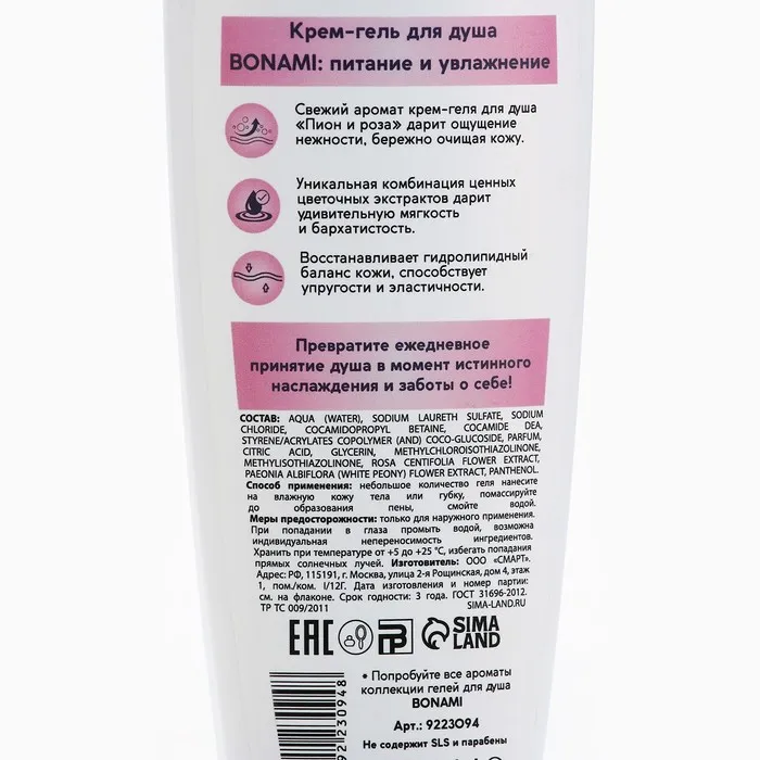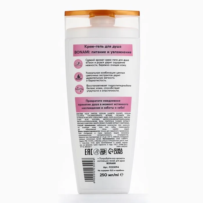 Гель для душа женский с пантенолом, 250 мл, аромат пиона и розы, BONAMI — Характеристики