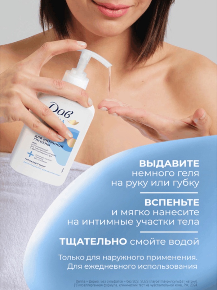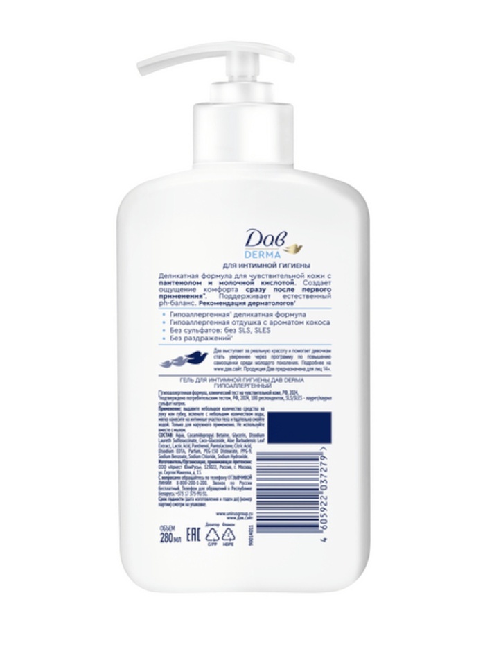 Гель для интимной гигиены Дав Derma – это средство ухода, созданное специально для женщин и девушек. Гипоаллергенная деликатная формула для чувствительной кожи с пантенолом и молочной кислотой поддерживает естественный pH - баланс интимной зоны.