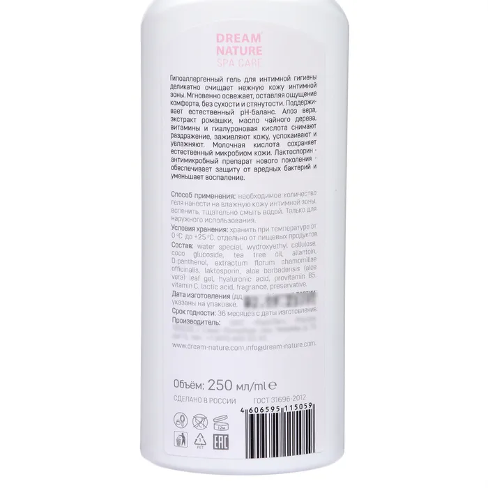 Гель для интимной гигиены Dream Nature Spa Care обеспечивает не только бережное очищение, но и поддержку естественного pH деликатной зоны благодаря молочной кислоте (lactic acid) в его составе. Также мыло для интимной гигиены включает в себя такие компоненты, как алоэ вера, которое обладает увлажняющим, антибактериальным эффектом, экстракт ромашки, снимающий раздражение и покраснения. Средство для интимной гигиены с гиалуроновой кислотой оказывает регенерирующее действие.