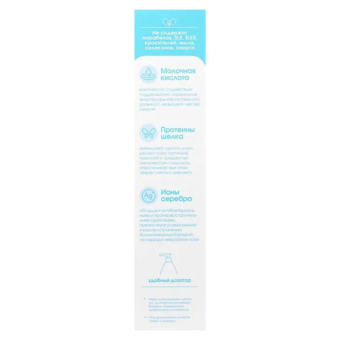 Состав: Aqua, Cocamidopropyl Betaine, Disodium Laureth Sulfosuccinate, Lauryl Glucoside, PEG-90 Glyceryl Isostearate, Laureth-2, PEG-7 Glyceryl Cocoate, Glycerin, Sodium Benzoate, Citric Acid, Parfum, Sodium Chloride, Lactic Acid (молочная кислота), Glycyrrhiza Glabra Root Extract (экстракт корня солодки), Allantoin (аллантоин), Sodium Caproyl/Lauroyl Lactylate, Triethyl Citrate (Dermosoft® decalact liquid), Sodium Salicylate (салицилат натрия), Hydrolyzed Milk Protein (экстракт молока), С 12-13 Alkyl Lactate, Hydrolyzed Silk (протеин шелка), Disodium EDTA, Diethylhexyl Sodium Sulfosuccinate, Titanium Dioxide, Propylene Glycol, Silver Chloride, Potassium Sorbate.