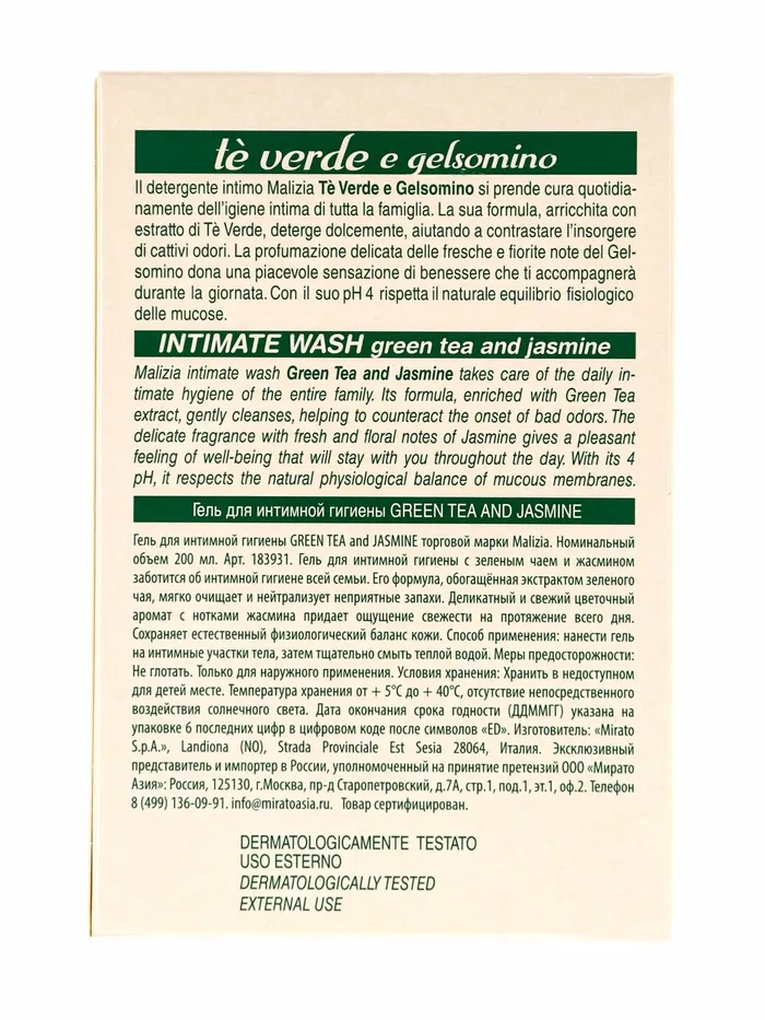 Гель для интимной гигиены MALIZIA с экстрактом зеленого чая и жасмина создан для бережного ухода за чувствительной кожей интимной зоны. Его мягкая pH-нейтральная формула (pH 5.5) поддерживает естественный баланс микрофлоры, обеспечивая деликатное очищение без сухости и раздражения.