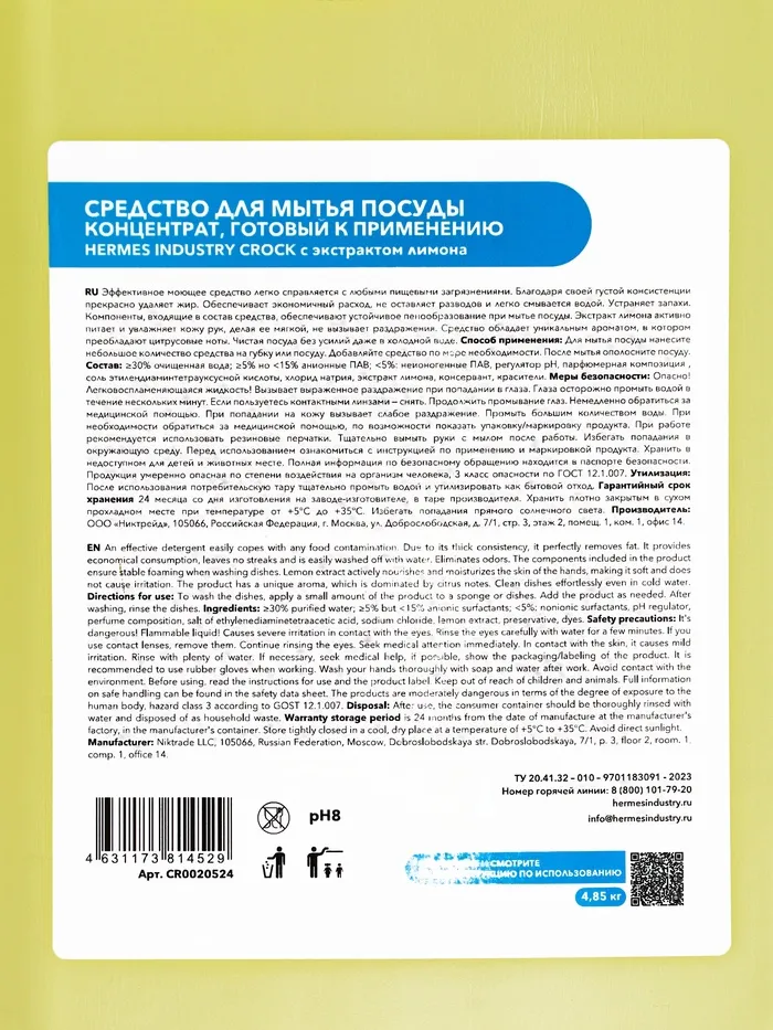 HERMES INDUSTRY Home Crock с ароматом лимона — это профессиональный гель для мытья посуды, который сочетает в себе высокую эффективность, бережное отношение к коже рук и свежий аромат, создающий ощущение настоящей чистоты.