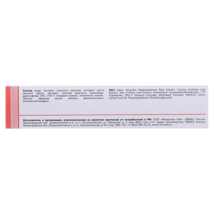 Состав: вода, экстракт конского каштана, экстракт листа лесного ореха, экстракт листьев красного винограда, аристофлекс AVC, ПЭГ-7 глицерил кокоат, этилгексил кокоат, ментол, эфирное масло лимона, феноксиэтанол, этилгексилглицерин.