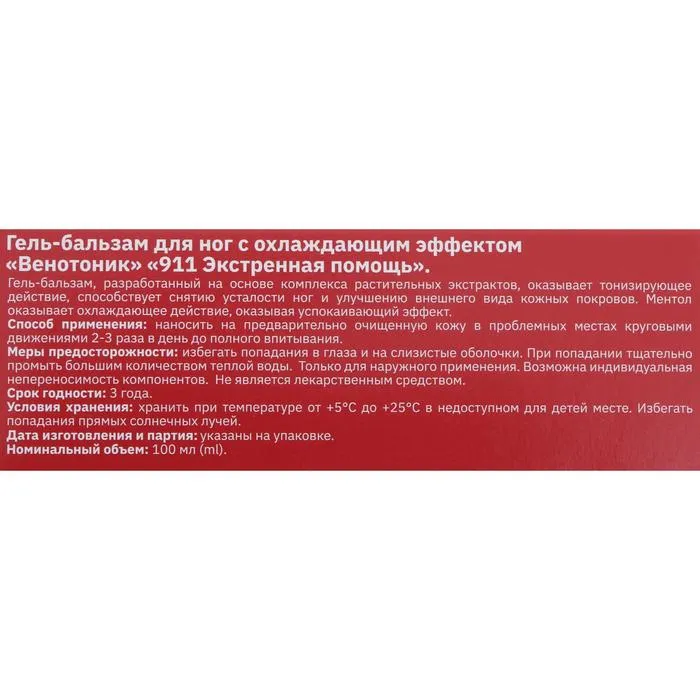 Гель-бальзам, разработанный на основе комплекса растительных экстрактов, оказывает венотонизирующее действие, способствует снятию усталости ног и уменьшению отёчности. Ментол оказывает охлаждающее действие, оказывая успокаивающий эффект на кожный покров.
