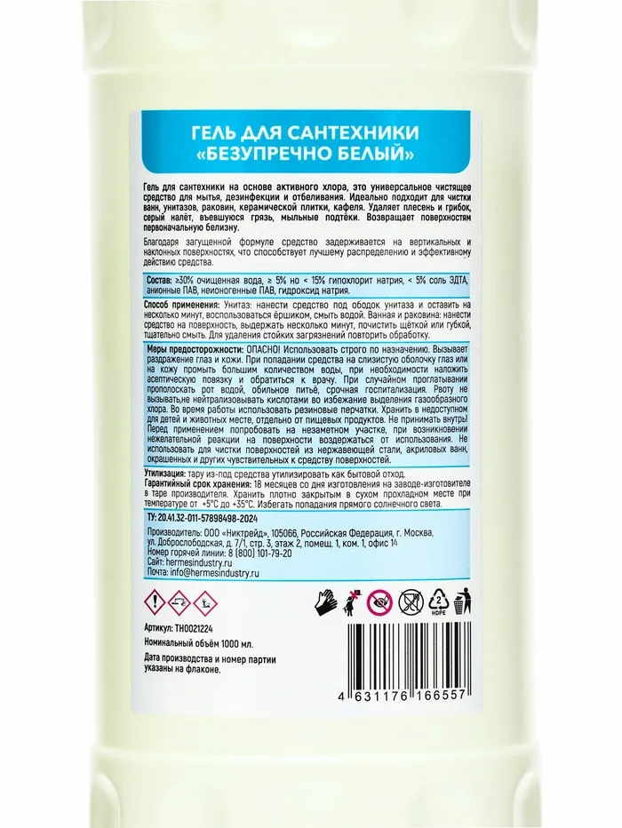 Hermes Industry HOME: Безупречно белый имеет высокую концентрацию активных компонентов, которые эффективно удаляют известковый налёт, ржавчину, мочевой камень и другие загрязнения, характерные для сантехнических изделий. Это средство обеспечивает глубокое очищение, не повреждая поверхность и не оставляя царапин, а его густая текстура позволяет наносить гель равномерно и точно, даже в труднодоступных местах.