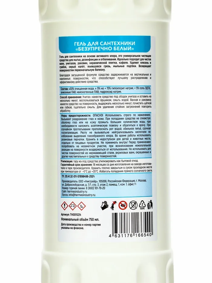 Hermes Industry HOME: Безупречно белый имеет высокую концентрацию активных компонентов, которые эффективно удаляют известковый налёт, ржавчину, мочевой камень и другие загрязнения, характерные для сантехнических изделий. Это средство обеспечивает глубокое очищение, не повреждая поверхность и не оставляя царапин, а его густая текстура позволяет наносить гель равномерно и точно, даже в труднодоступных местах.