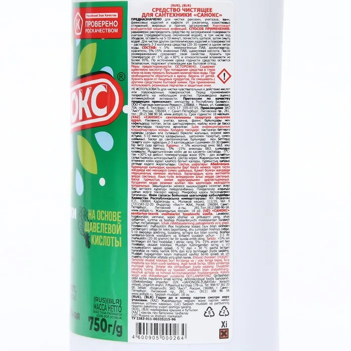 Чистящее средство для сантехники, предназначено для чистки раковин, унитазов, ванн, фаянсовых изделий и кафеля от ржавчины, известковых отложений, жировых и прочих загрязнений. Уничтожает возбудителей кишечной инфекцией.