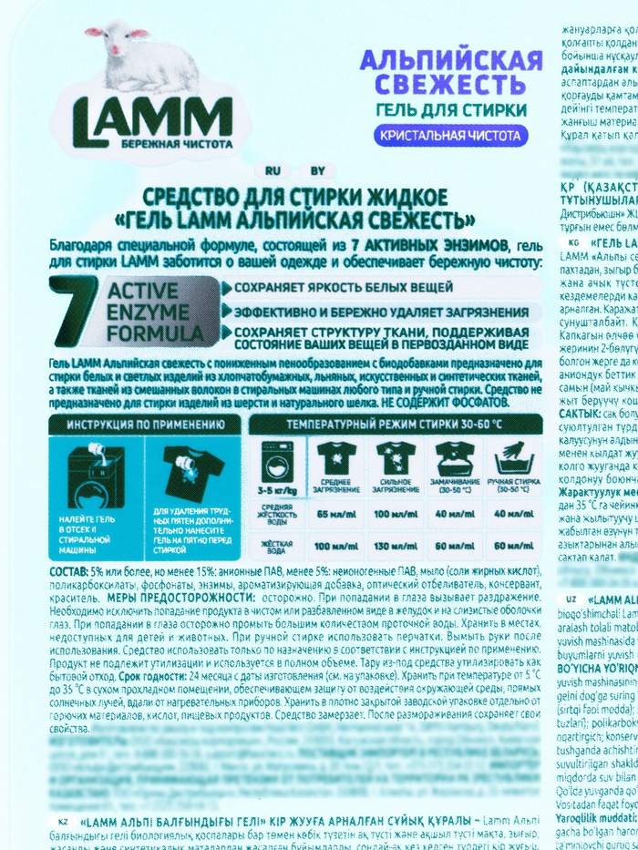 LAMM «Альпийская свежесть» — это гель для стирки, который сочетает эффективное удаление загрязнений с неповторимым ароматом свежести горных вершин. Средство подходит для различных видов тканей и обеспечивает чистоту, мягкость и приятный аромат после каждой стирки.
