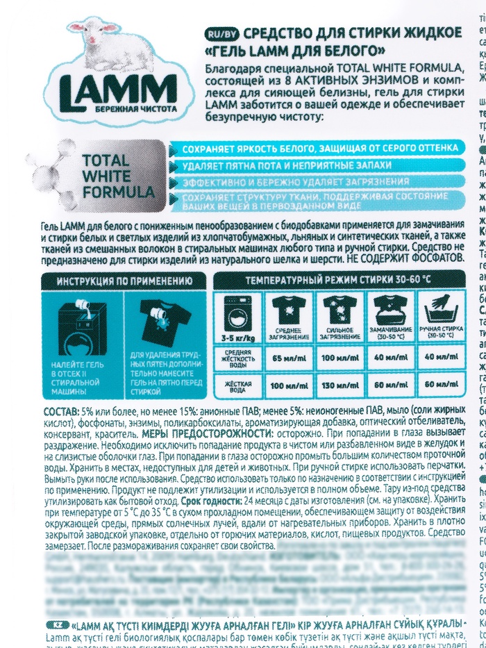 LAMM для белого создан для людей, которые ценят яркость, чистоту и долговечность своих вещей. Это идеальный выбор для поддержания белого белья, одежды и текстиля дома.