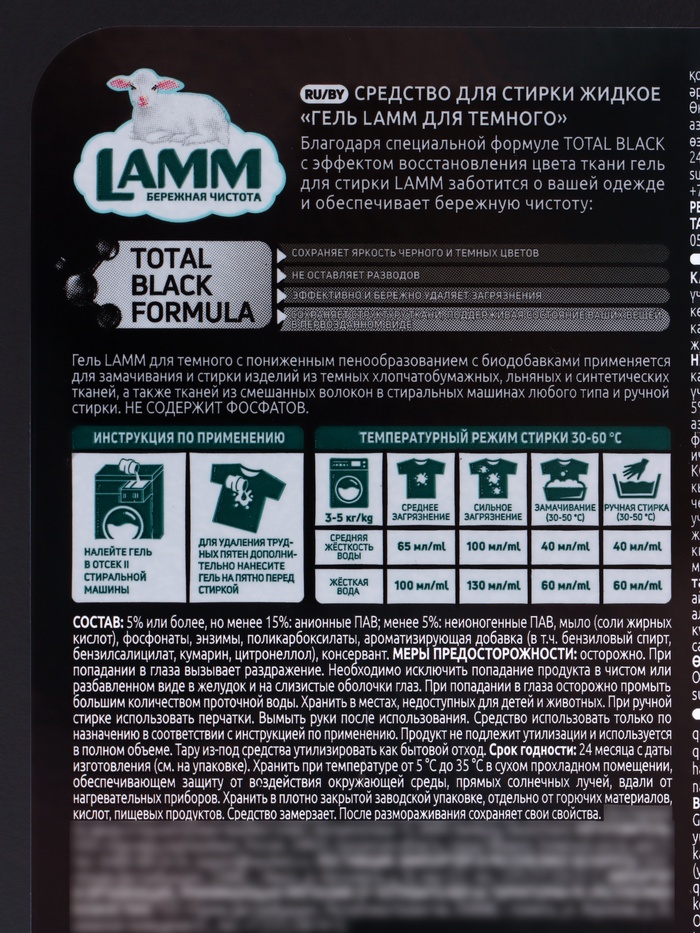LAMM для тёмного создан для людей, которые ценят яркость и долговечность тёмной одежды. Средство идеально подходит для регулярного ухода за тёмными вещами, обеспечивая чистоту, свежесть и насыщенность цвета после каждой стирки.