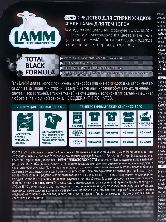 LAMM для тёмного — это специальный гель для стирки тёмных тканей, разработанный для сохранения насыщенности цвета и защиты от выцветания. Средство эффективно удаляет загрязнения, ухаживает за волокнами ткани и поддерживает яркость и глубину тёмных оттенков.