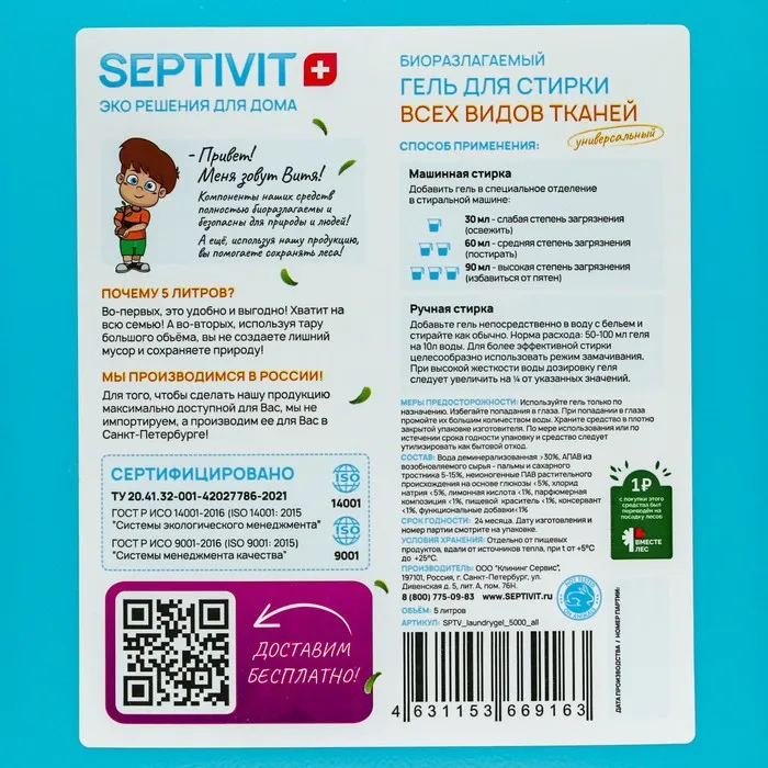Гель для стирки SEPTIVIT "Голубой лён" для всех видов тканей, 5 л — Характеристики