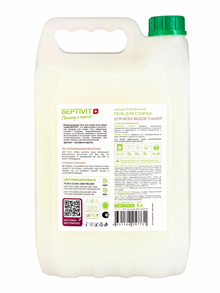 Гель для стирки SEPTIVIT «Миндальное молочко», для всех видов тканей, 5 л — Характеристики