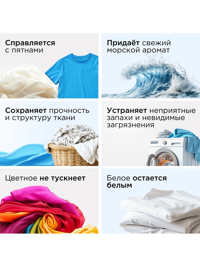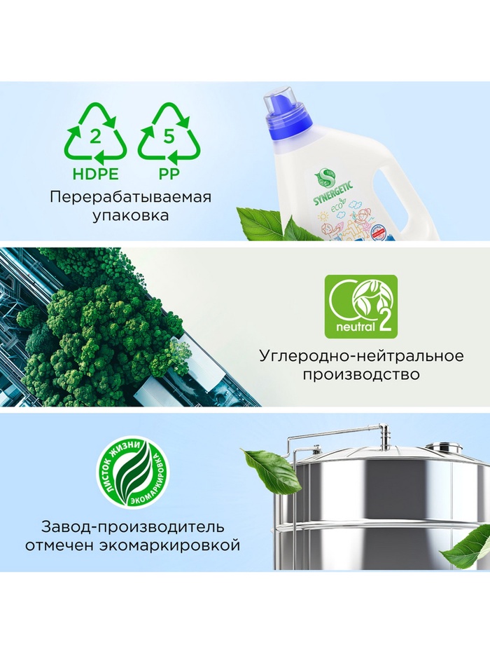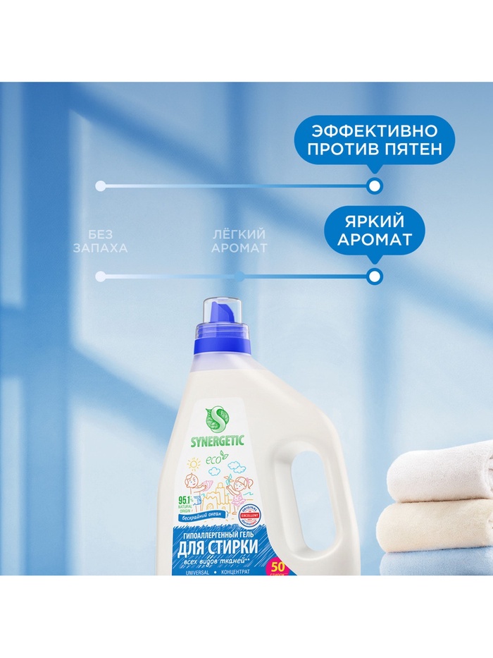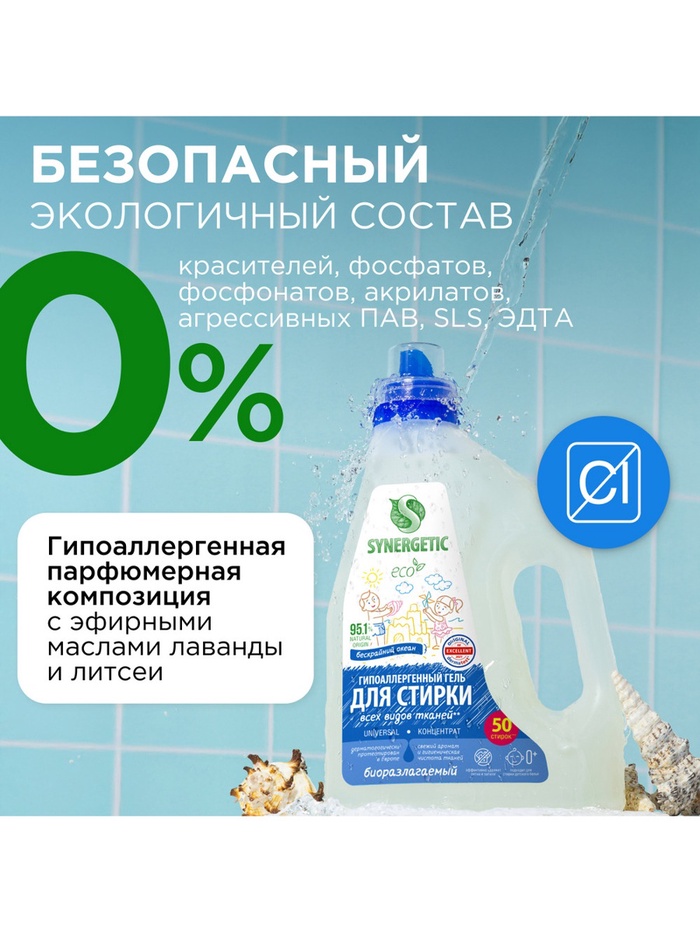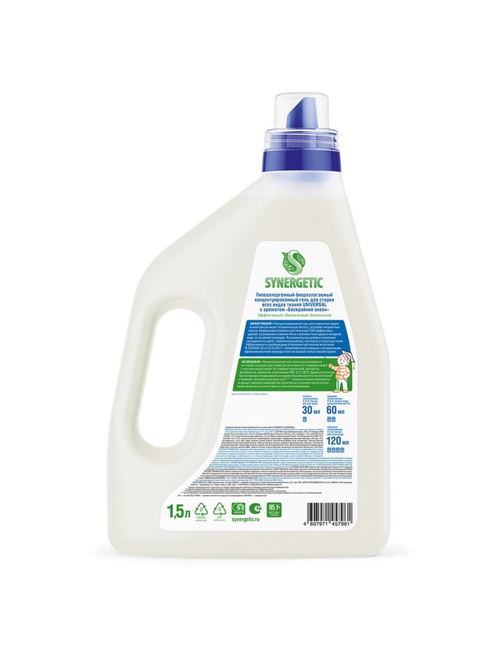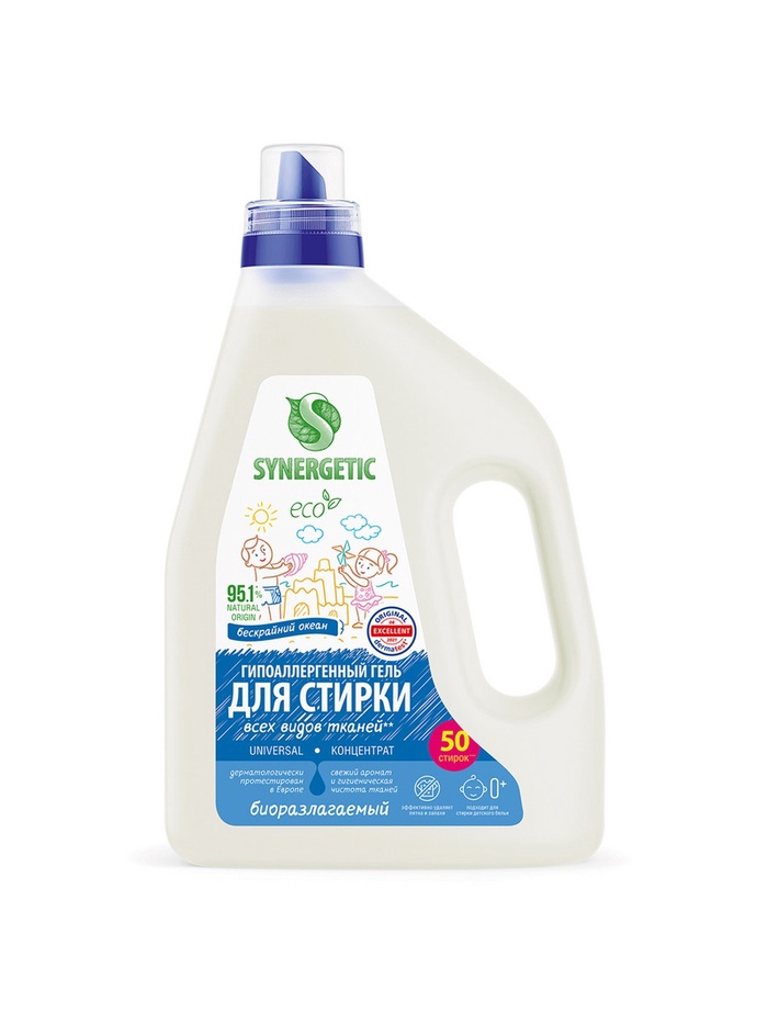 Биоразлагаемый концентрированный гель для стирки всех видов тканей SYNERGETIC UNIVERSAL с ароматом "Бескрайний океан" обеспечивает бережное и эффективное очищение тканей, гигиеническую чистоту одежды и устраняет неприятные запахи.