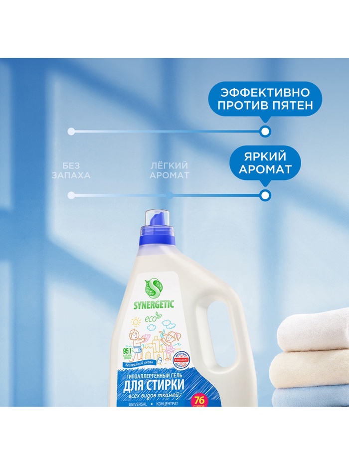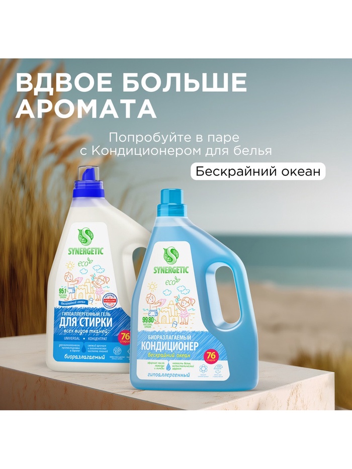 Биоразлагаемый концентрированный гель для стирки всех видов тканей SYNERGETIC UNIVERSAL с ароматом "Бескрайний океан" обеспечивает бережное и эффективное очищение тканей, гигиеническую чистоту одежды и устраняет неприятные запахи.