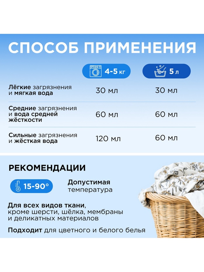 Гель предназначен для стирки всех видов тканей, кроме деликатных и мембранных, а также шерсти и шелка. Биоразлагаемый гель полностью выполаскивается из тканей, подходит для стирки детского белья 0+ и одежды людей с чувствительной кожей.