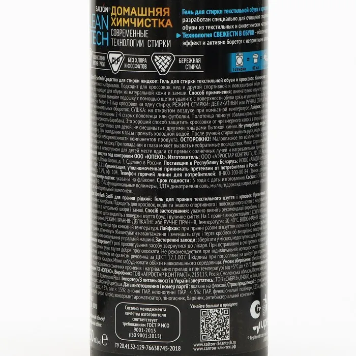 Гель для стирки текстильной обуви и кроссовок Salton CleanTech, 250 мл — Характеристики