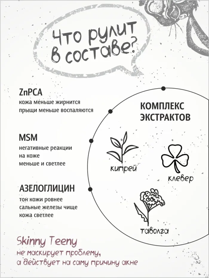 Aqua, Cocamidopropyl Betaine, Sodium Lauroyl Sarcosinate, Sodium Cocoamphoacetate, Glycerin, Lauryl Glucoside, Acrylates Copolymer, PEG-7 Glyceryl Cocoate, Beta-Cyclodextrin, Zinс PCA, Salicylic Acid, Dipotassium Glycyrrhizinate, Potassium Azeloyl Diglycinate, Coco-Glucoside, Glyceryl Oleate, Trifolium Рraténse Extraсt, Chamerion Angustifolium Extraсt, Filipéndula Extraсt, Dimethyl Sulphone, Phenoxyethanol, Acrylic Polymer, PEG-200 Hydrogenated Glyceryl Palmate, Parfum, Mentha Arvensis Leaf Oil, Menthol, Disodium EDTA, Sodium Hydroxide, Chlorphenesin, Sodium Benzoate, Potassium Sorbate.