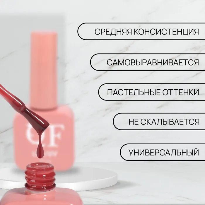 Камуфлирующий гель лак предназначен как для создания французского маникюра, так и для самостоятельного покрытия. Имеет среднюю, полупрозрачную консистенцию, отлично самовыравнивается, не скалывается, не царапается и не отслаивается.