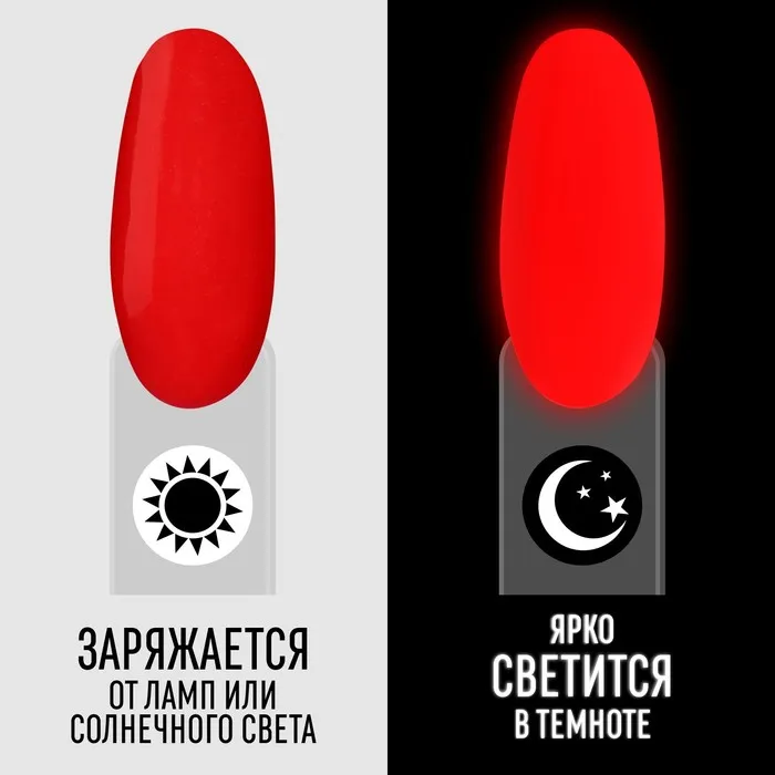 Привлекательные цвета, которые можно дополнять декором и делать маникюр ещё более запоминающимся. Люминесцентный гель лак — это неоновый лак, который светится в темноте! Он накапливает на свету ультрафиолетовое излучение, после чего начинает эффектно светиться в темноте.Индикатор цвета на верху бутылька, поможет Вам подобрать идеальный цвет.
