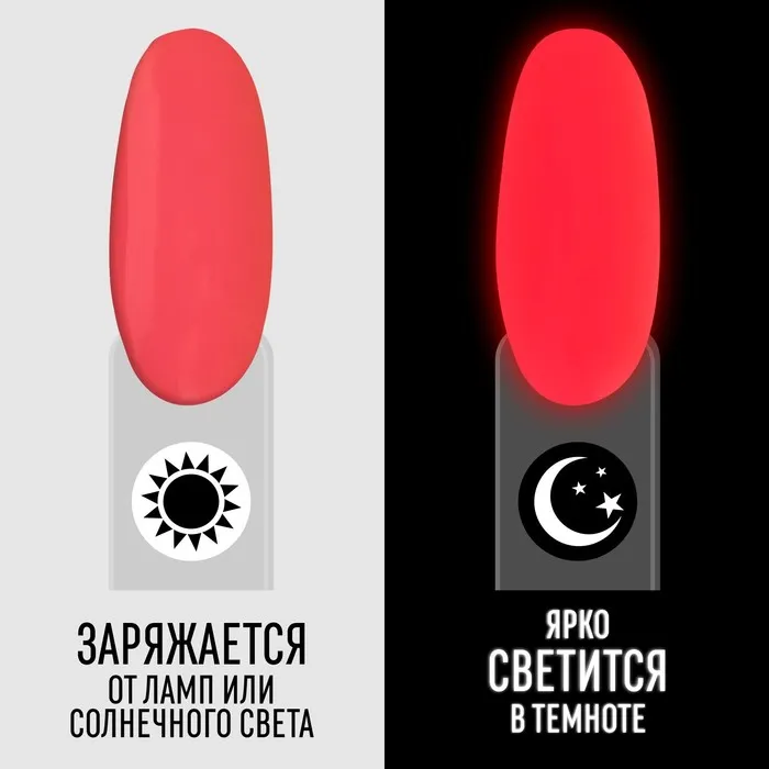 Привлекательные цвета, которые можно дополнять декором и делать маникюр ещё более запоминающимся. Люминесцентный гель лак — это неоновый лак, который светится в темноте! Он накапливает на свету ультрафиолетовое излучение, после чего начинает эффектно светиться в темноте.Индикатор цвета на верху бутылька, поможет Вам подобрать идеальный цвет.
