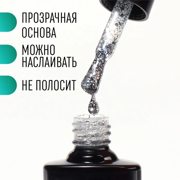 Глубокое сияние гель лака раскрывается при попадании на покрытие света. Прозрачный лак с крупными блёстками равномерно распределяется и идеально сцепляется с ногтевой пластиной. Используйте для праздничного и повседневного дизайна.Индикатор цвета на верху бутылька, поможет Вам подобрать идеальный цвет.