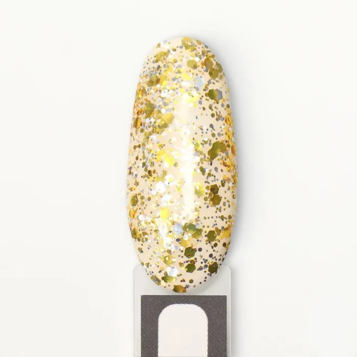 Глубокое сияние гель лака раскрывается при попадании на покрытие света. Прозрачный лак с крупными блёстками равномерно распределяется и идеально сцепляется с ногтевой пластиной. Используйте для праздничного и повседневного дизайна.Индикатор цвета на верху бутылька, поможет Вам подобрать идеальный цвет.