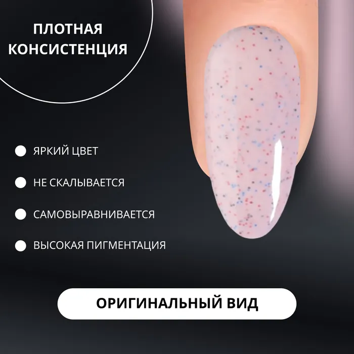 Экспериментируйте с новыми покрытиями, создавая с ними мягкий переход в стиле градиента, покрывайте матовым топом или оставляйте в глянце - вкрапления придадут любому Вашему дизайну оригинальный вид. Гель лак имеет плотную консистенцию, что обеспечивает идеальное ровное покрытие. Оригинальностью гель лака являются мелкие вкрапления, напоминающие брызги конфетти, потали, которые придают маникюру утонченность и делают его по-настоящему запоминающимся.