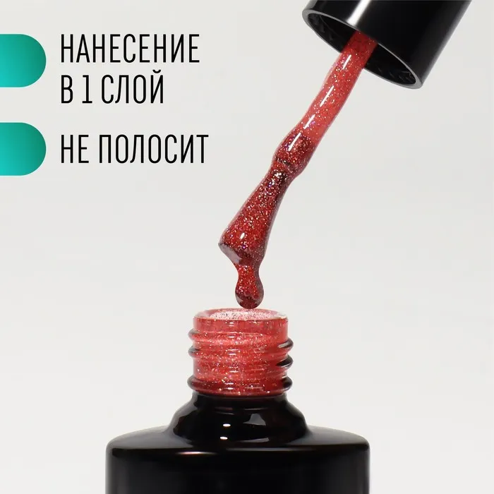Глубокое сияние гель лака раскрывается при попадании на покрытие освещения. Уникальная формула лака с блёстками отражает всю силу лучей света, благодаря чему достигается эффект, будто ногти посыпаны магической пылью. Индикатор цвета на верху бутылька, поможет Вам подобрать идеальный цвет.