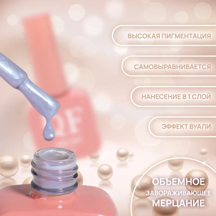 Деликатное сияние гель лака раскрывается при попадании на покрытие света. Перламутровый лак равномерно распределяется и идеально сцепляется с ногтевой пластиной. Используйте для праздничного и повседневного маникюра. Индикатор цвета на верху бутылька, поможет Вам подобрать идеальный цвет.