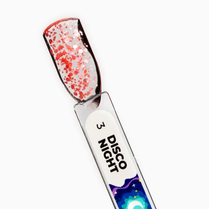 Гель-лак содержит микс цветных неоновых шестигранников на прозрачном фоне. Можно использовать в качестве самостоятельного покрытия или в различных дизайнах — градиент, растяжка, омбре. Не требует нанесения базы, можно сразу наносить на ноготь. Консистенция гель-лака позволяет выполнять выравнивание, чтобы блестки легли более плотно для яркого эффекта.