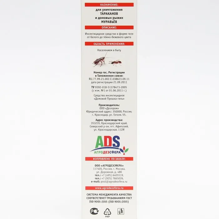 Инсектецидное средство гель защитит ваш дом и избавит от всех видов тараканов и рыжих домовых муравьёв. Способ применения: гель наносят пунктиром на поверхности или размещают на подложках в местах появления насекомых. Гибель тараканов наступает на 2-3 сутки, муравьёв - через 1 сутки. Повторное применение рекомендуется при появлении насекомых, но не ранее чем через 4 недели, т.к. средство обладая кишечно-контактным действием, сохраняет свою эффективность в течение 1,5-2 месяцев. Состав: фипронил 0,05%, стабилизатор, консервант, гелеобразователь, битрекс, вода, пищевые аттрактанты.