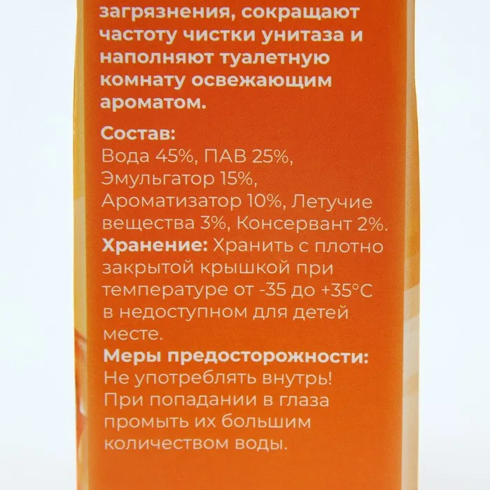 Освежитель имеет яркий и насыщенный аромат апельсина, который мгновенно наполняет помещение свежестью и создает атмосферу уюта. В состав продукта входят специальные компоненты, которые обеспечивают обильную пену и эффективно борются с загрязнениями и неприятными запахами.