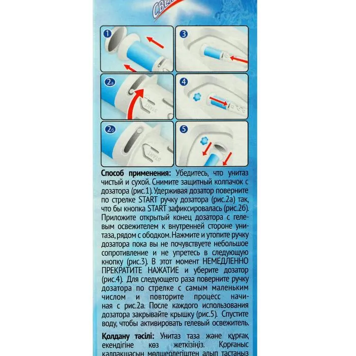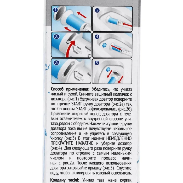 Гелевый освежитель с дозатором представляет собой моющее средство для унитаза. Отличается длительным действием. Препятствует отложению известкового налёта, водного и мочевого камня. Распространяет приятный запах.