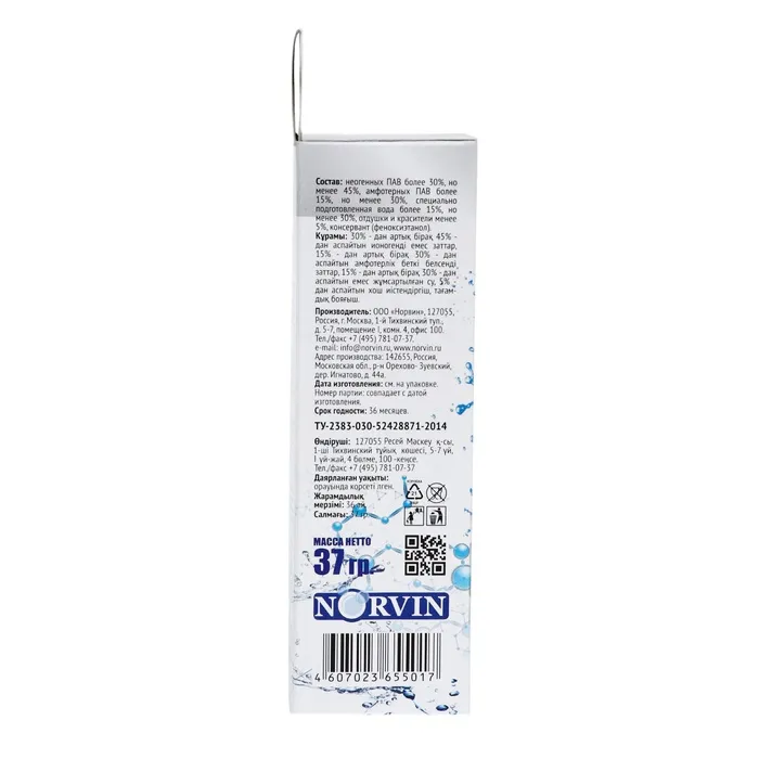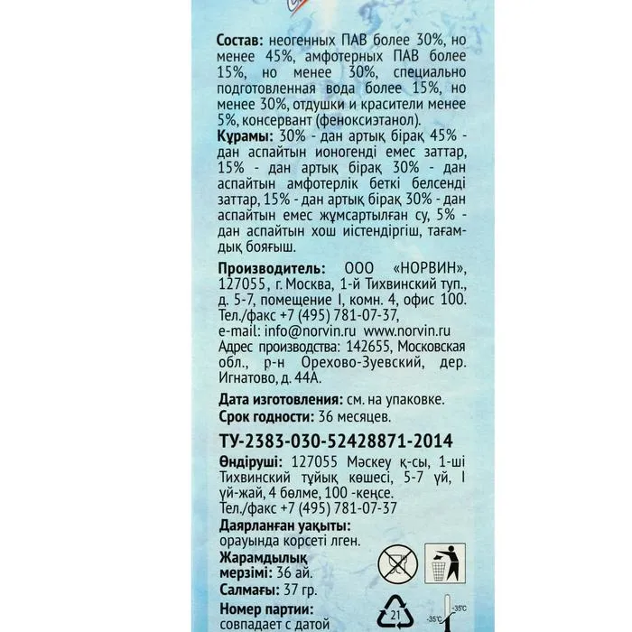 Состав: умягченная вода, более 30% неиногенных поверхно-активных веществ, более 5% но не менее 15% амфотерных поверхностно-активных веществ, менее 5% отдушки, пищевой краситель.