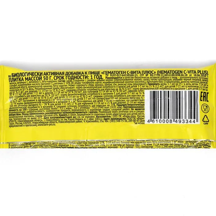 Гематоген «С-Вита Плюс» − это 50-граммовая плитка классического гематогена с повышенным содержанием железа и комплексом необходимых организму витаминов. Благодаря входящему в состав сгущенному молоку, гематоген, несмотря на большое содержание железа, имеет приятный сливочный вкус и отличается мягкой текстурой. Продукт зарегистрирован как биологически активная добавка и имеет срок годности 12 месяцев.