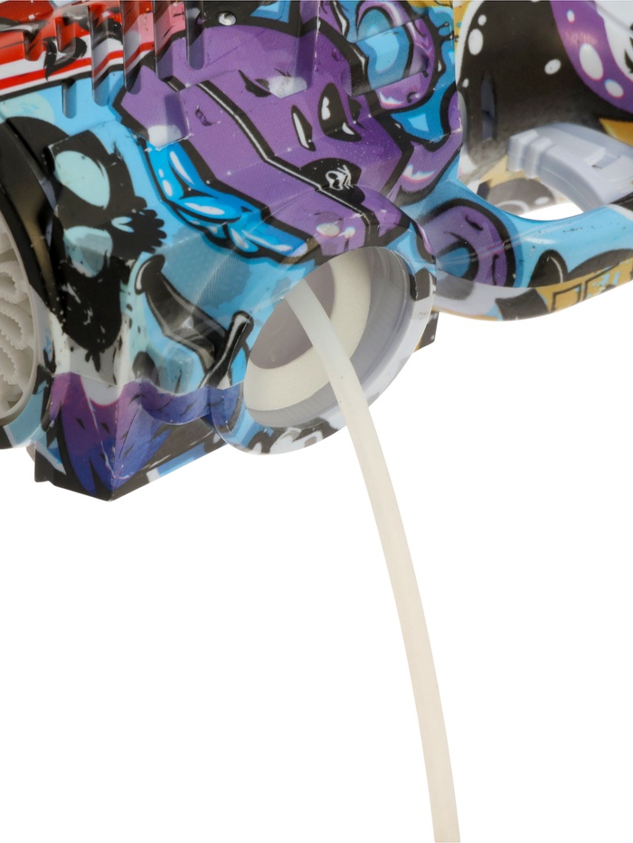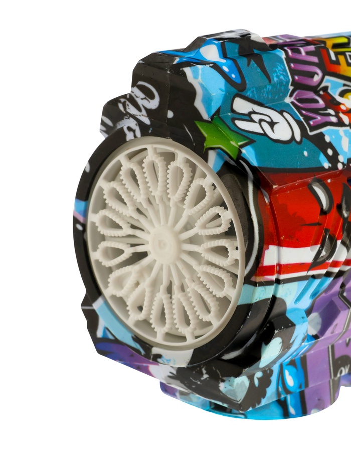 - Мощный автоматический выдув: устройство создаёт непрерывный поток из сотен мыльных пузырей без усилий — ребёнку достаточно нажать одну кнопку.