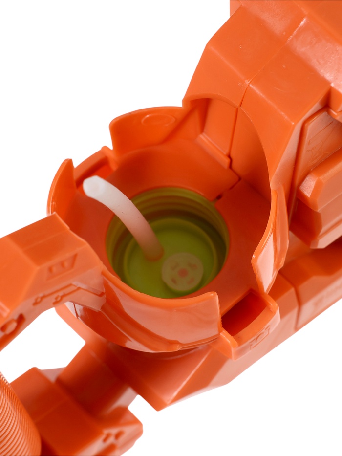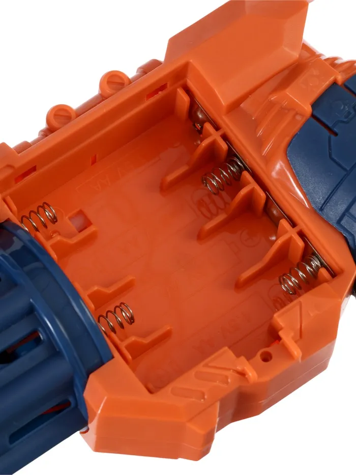 - Эргономичный дизайн: корпус выполнен в форме пулемёта с удобным захватом для обеих рук. Конструкция устойчива и удобна для использования детьми от 3 лет.