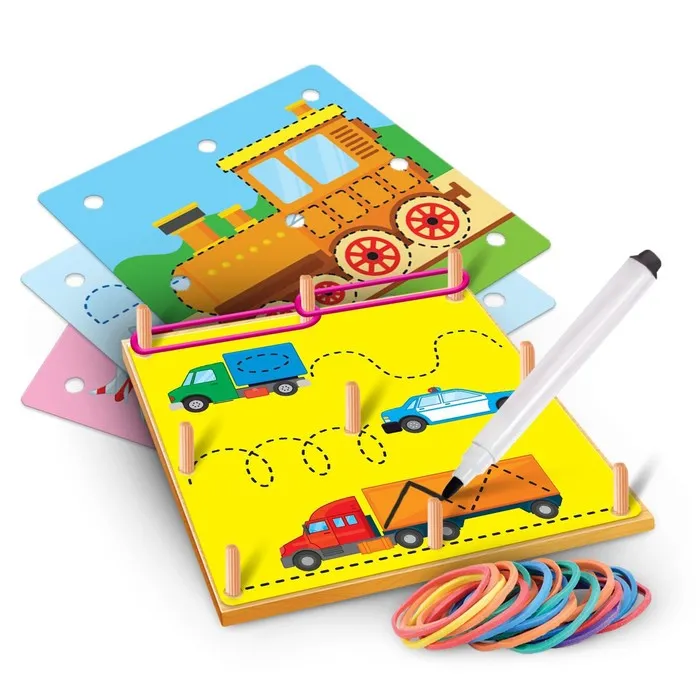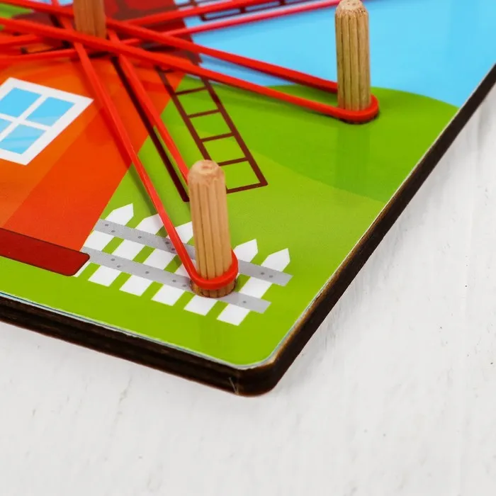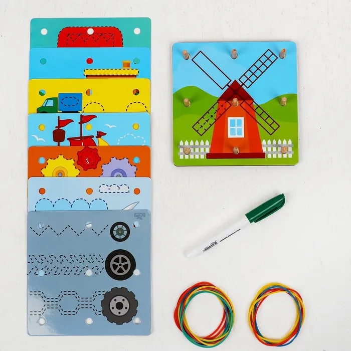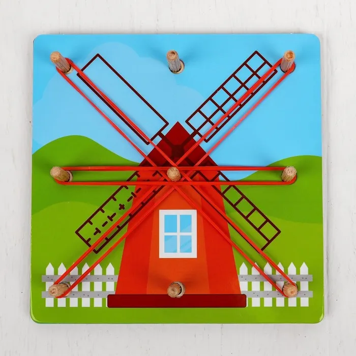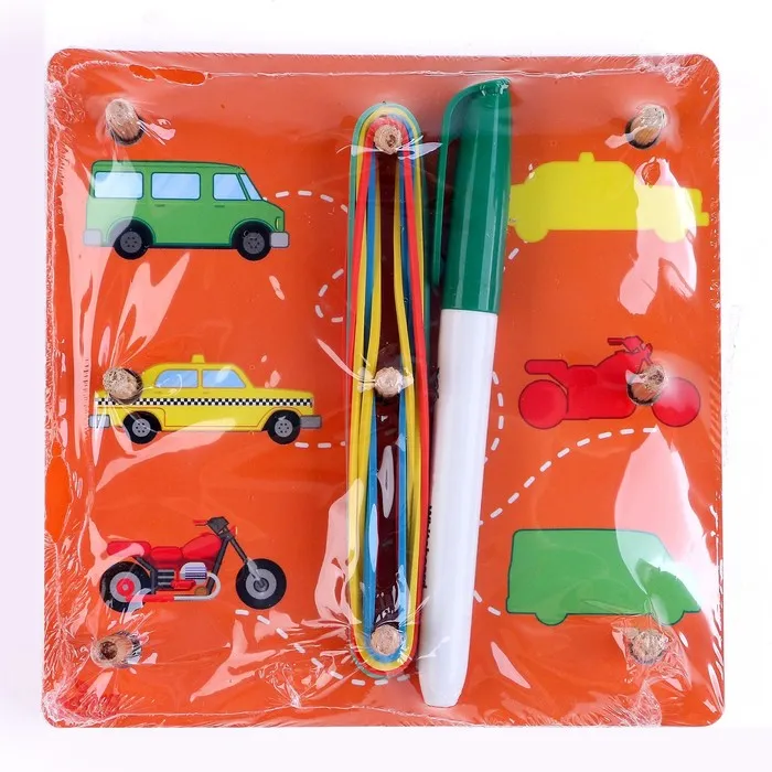 Геоборд представляет собой плоское поле (обычно в форме квадрата или прямоугольника) с равноудалёнными друг от друга штырьками. Суть игры - создавать различные фигуры, надевая на штырьки резиночки. Сначала предложите малышу повторить схемы из набора, а затем попросите придумать историю и обыгрывать её с помощью резиночек на геоборде.