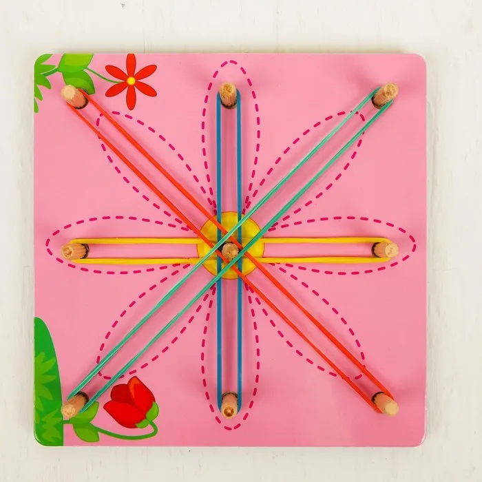 Геоборд представляет собой плоское поле (обычно в форме квадрата или прямоугольника) с равноудалёнными друг от друга штырьками. Суть игры - создавать различные фигуры, надевая на штырьки резиночки. Сначала предложите малышу повторить схемы из набора, а затем попросите придумать историю и обыгрывать её с помощью резиночек на геоборде.