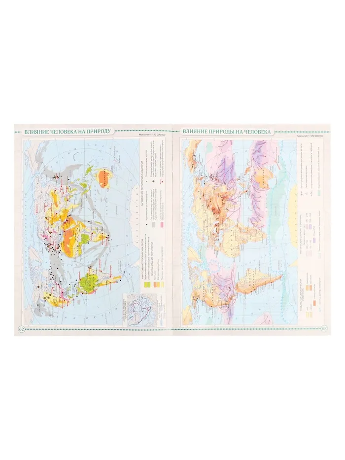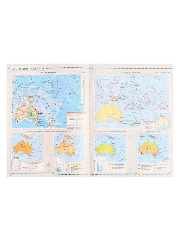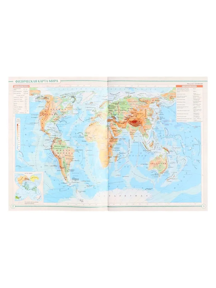 - 64 страницы содержат подробные тематические карты, включая физические, климатические, политические и карты объектов Всемирного наследия ЮНЕСКО.