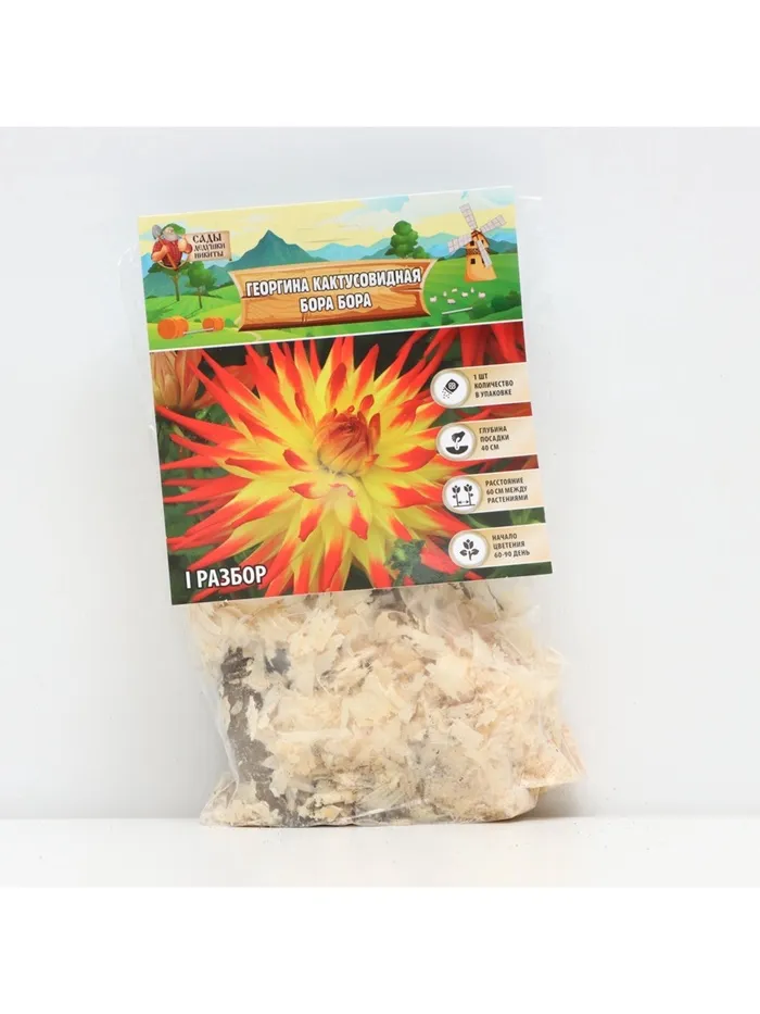 Георгина "Бора-Бора" является прекрасной представительницей кактусовидных георгин, с длинными узкими изогнутыми лепестками, которые придают ей вид таинственных подводных актиний. Листва тёмно-зелёная. Цветки диаметром до 20 см, желтые в центре с постепенно меняющиеся на оранжево-красный на кончиках лепестков. Отличная срезка!
