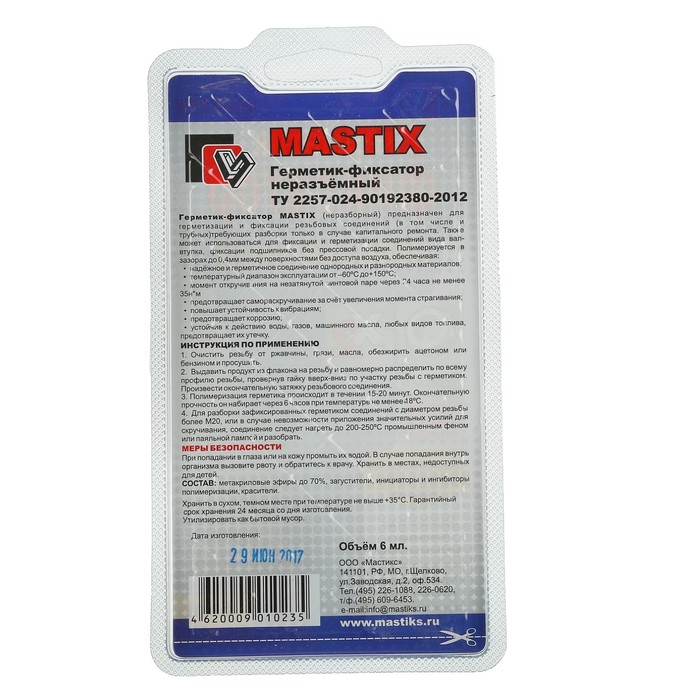 С помощью MASTIX вы зафиксируете и загерметизируете неразборные резьбовые соединения, подверженные вибрации и влиянию других вывинчивающих сил, а также валы-втулки и подшипники без прессовой посадки. Состав полимеризуется в зазорах до 0,4 мм без доступа воздуха, надёжно скрепляет детали и предотвращает появление коррозии. Средство устойчиво к воздействию топлива, машинного масла, газов и воды.