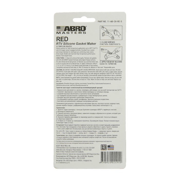 Герметик прокладок ABRO MASTERS красный, силиконовый, высокотемпературный, 85 г, 11-AB-CH-RE-S — Характеристики