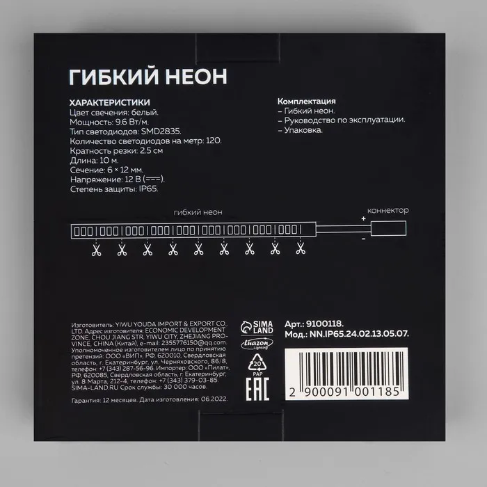 Гибкий неон Luazon Lighting 6 × 12 мм, IP65, 10 м, SMD2835, 120 LED/м, 12 В, свечение белое — Характеристики