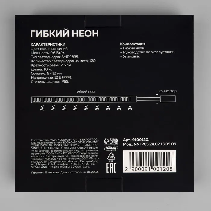Гибкий неон Luazon Lighting 6 × 12 мм, IP65, 10 м, SMD2835, 120 LED/м, 12 В, свечение синее — Характеристики