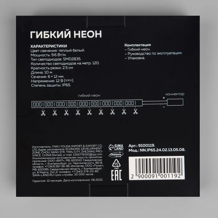 Гибкий неон Luazon Lighting 6 × 12 мм, IP65, 10 м, SMD2835, 120 LED/м, 12 В, свечение тёплое белое — Характеристики