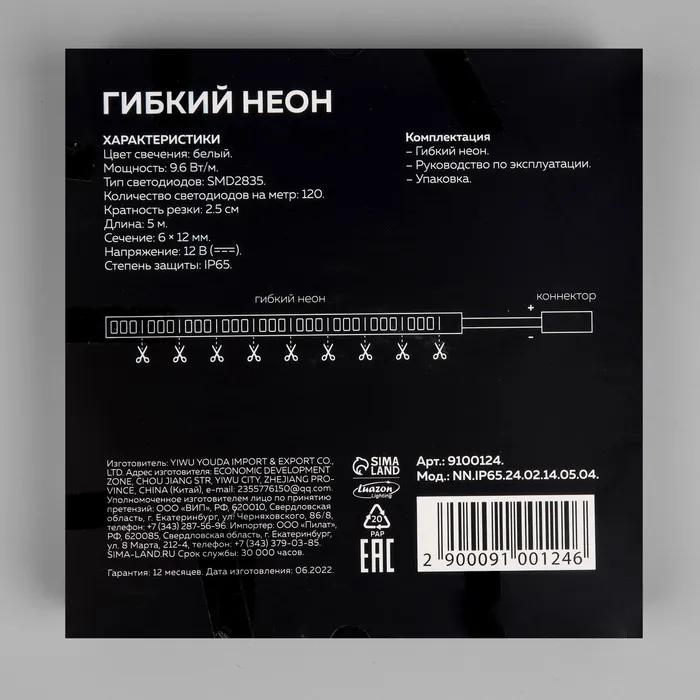 Гибкий неон Luazon Lighting 6 × 12 мм, IP65, 5 м, SMD2835, 120 LED/м, 12 В, свечение белое — Характеристики