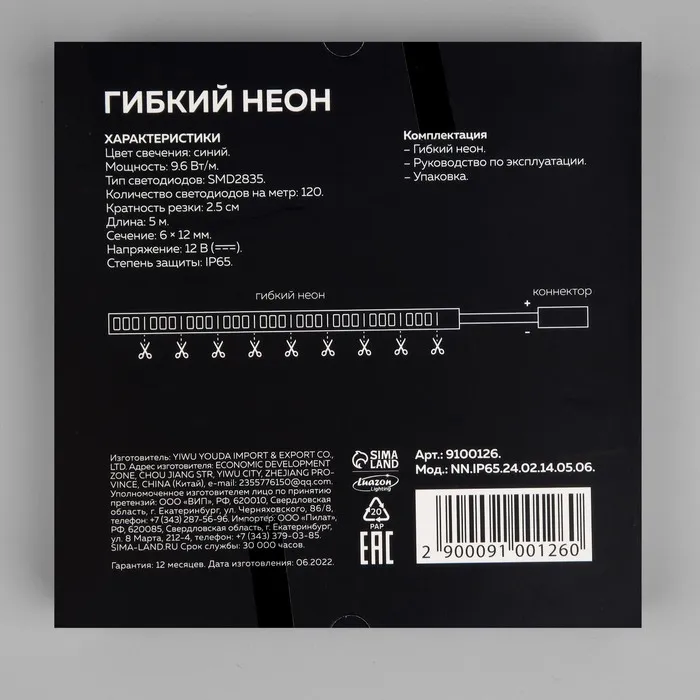 Гибкий неон Luazon Lighting 6 × 12 мм, IP65, 5 м, SMD2835, 120 LED/м, 12 В, свечение синее — Характеристики